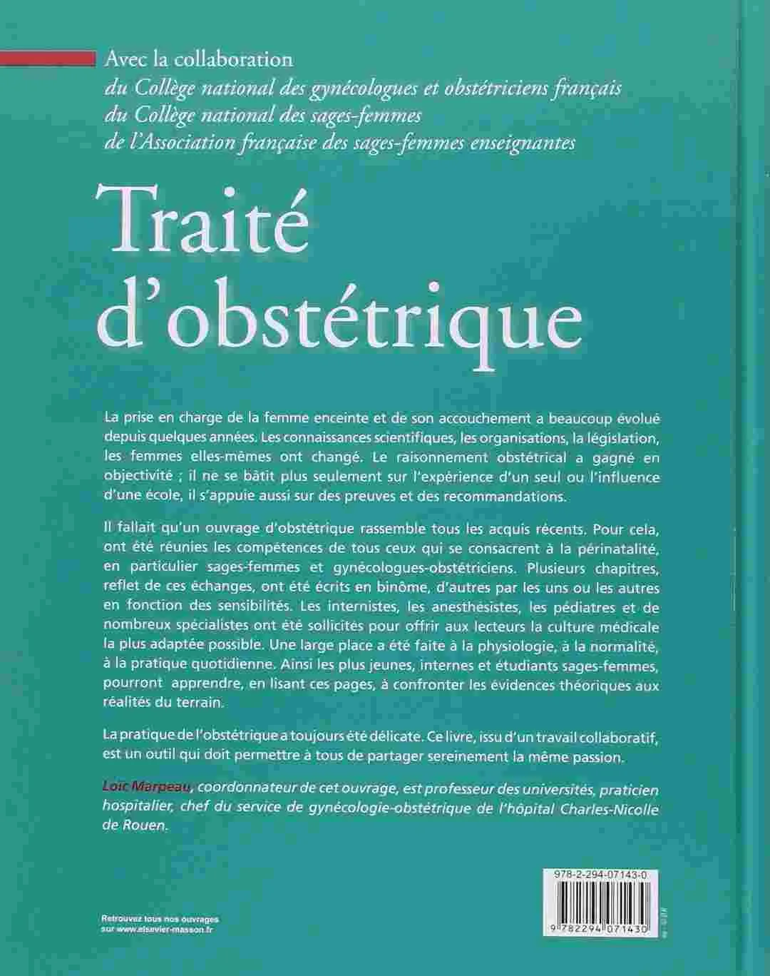 La prise en charge de la femme enceinte et de son accouchement a beaucoup evolue depuis quelques annees. Les connaissances scientifiques les organisations la legislation les femmes elles-memes ont change. Le raisonnement obstetrical a gagne en objectivite ; il ne se batit plus seulement sur l’experience d’un seul ou l’influence d’une ecole il s’appuie aussi sur des preuves et des recommandations. Il fallait qu’un ouvrage d’obstetrique rassemble tous les acquis recents.
